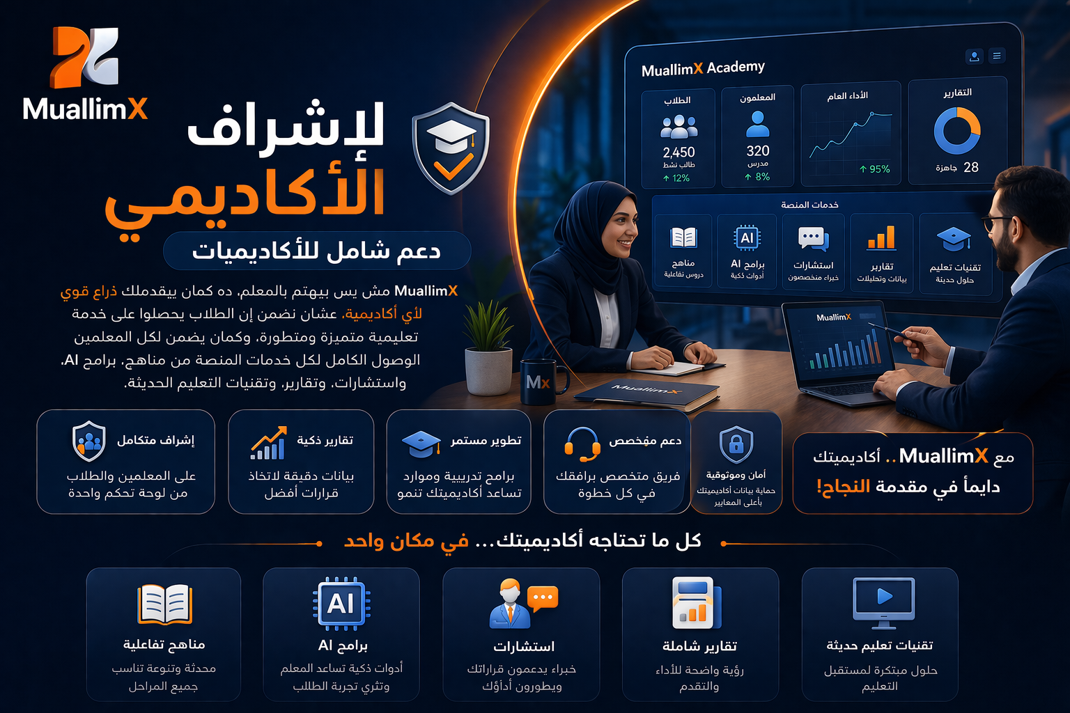 اكتشف ما تقدمه Muallimx للمعلمين والأكاديميات — عرض واضح لكل خدمة مع التفاصيل الكاملة.