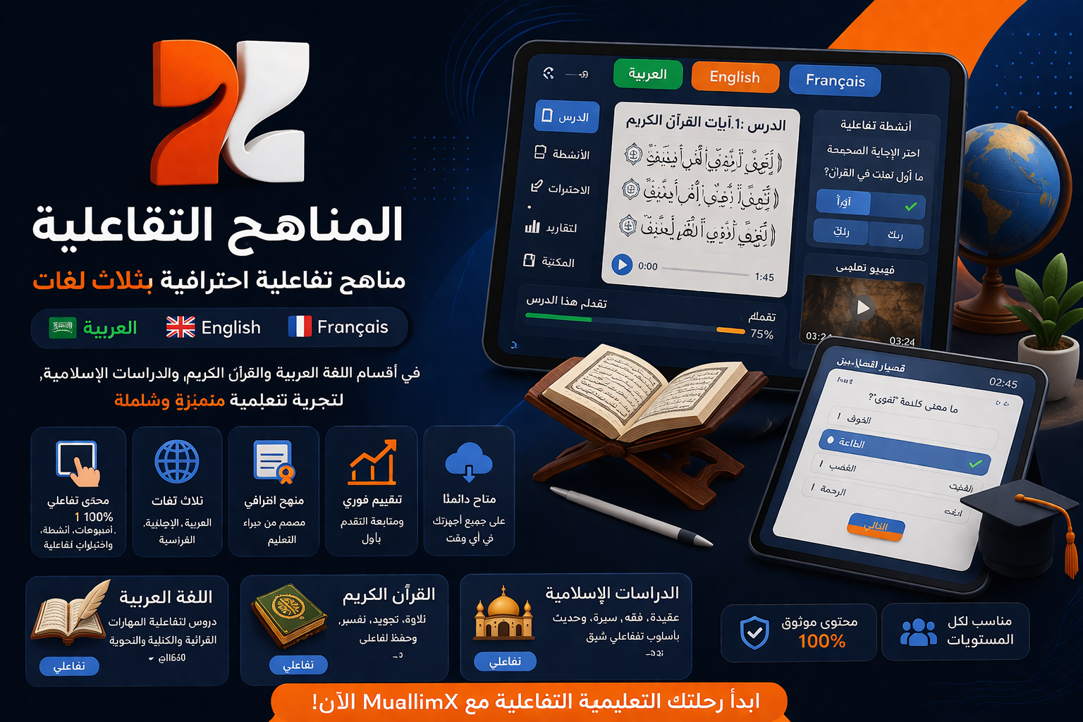 مناهج تفاعلية احترافية بثلاث لغات (العربية – الإنجليزية – الفرنسية) في أقسام اللغة العربية والقرآن الكريم والدراسات الإس...